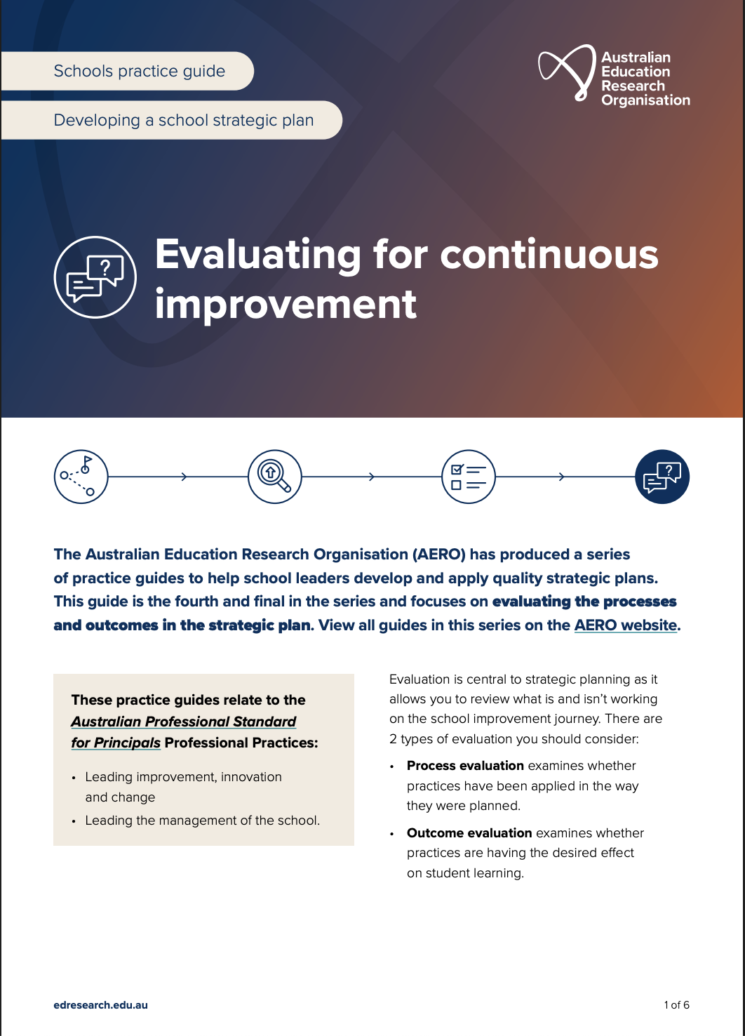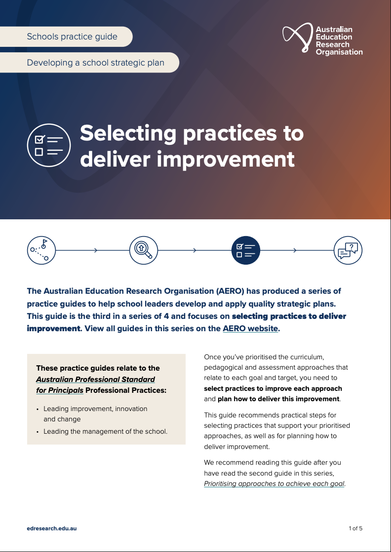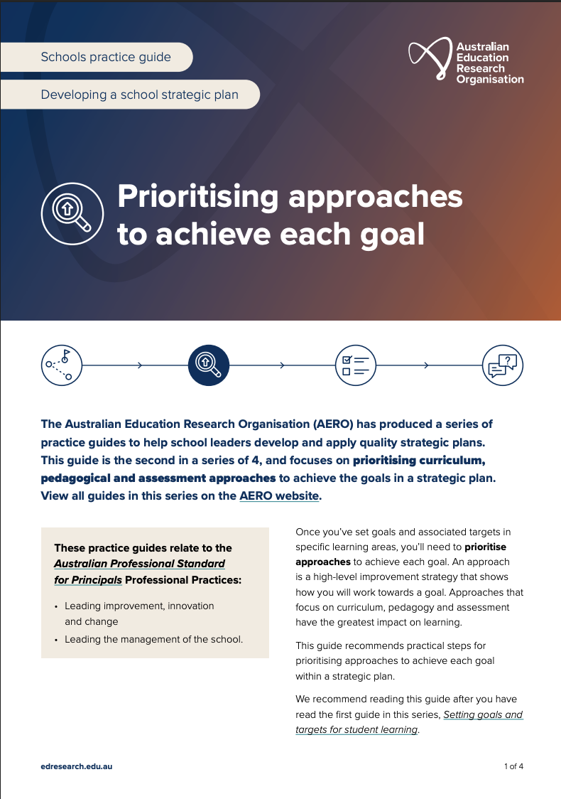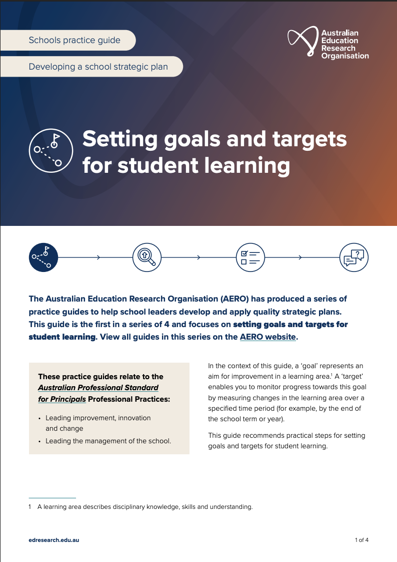 Learning First and the Australian Education Research Organisation (AERO) have produced a series of practice guides to help school leaders develop and apply effective strategic plans. Guide 1 focuses on practical steps for setting goals and targets for student learning.